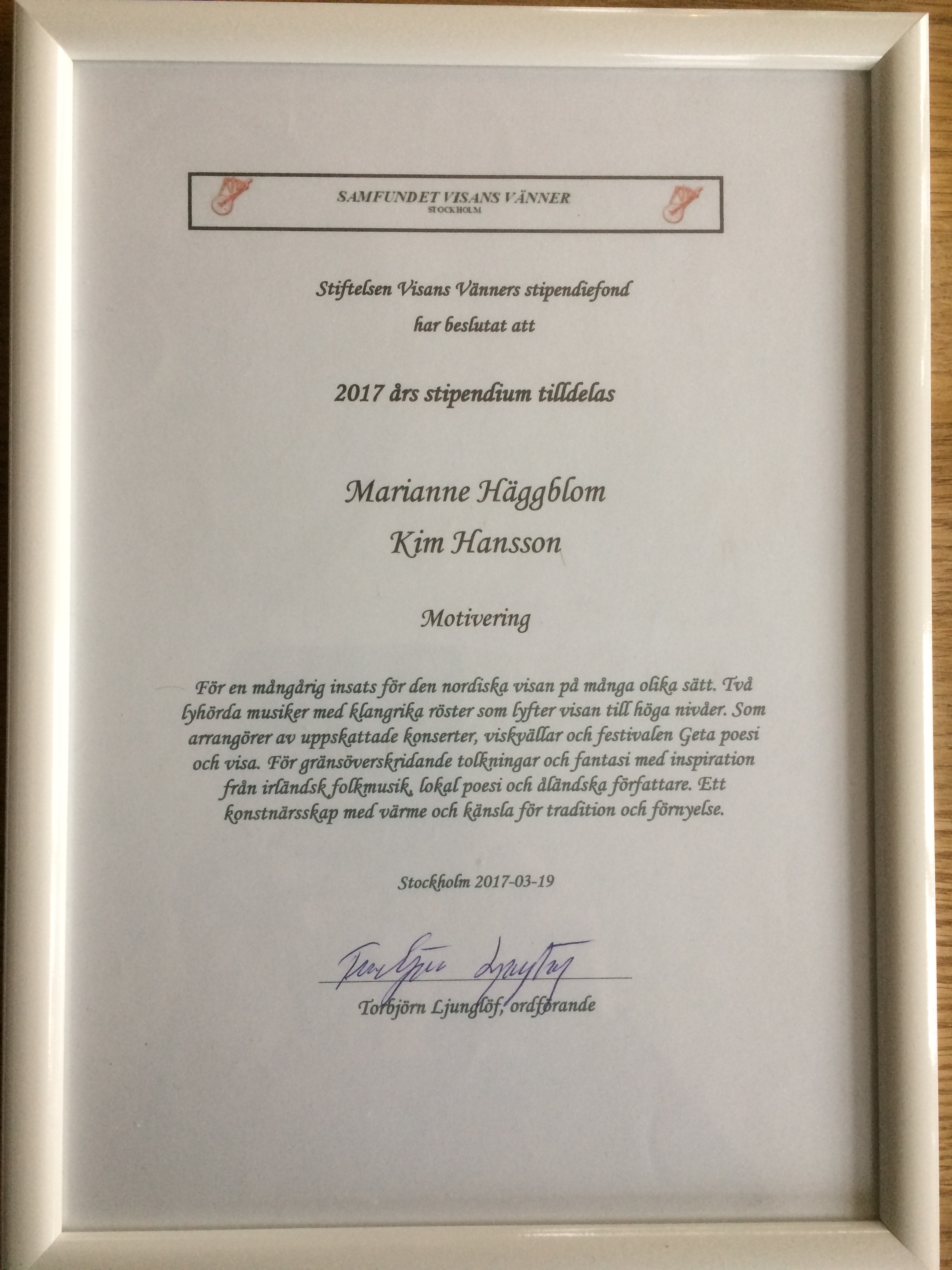 …till två av Tidens Brus medlemmar. Kim & Marianne fick samfundet Visans Vänners stipendium 2017 vid den högtidliga utdelningen i Stockholm 19 mars 2017.