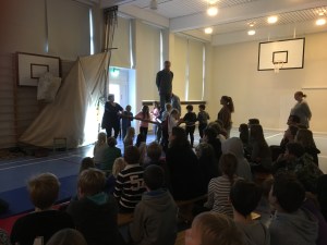 I vårt Finland 100-års program gjorde vi shantyworkshops i flera lågstadieskolor. Barnen gillade verkligen att hänga med på äventyr i shantyanda och vi hoppas kunna fortsätta hålla fler workshops under 2018. Här en gångspelsbild från Eckerö skola.