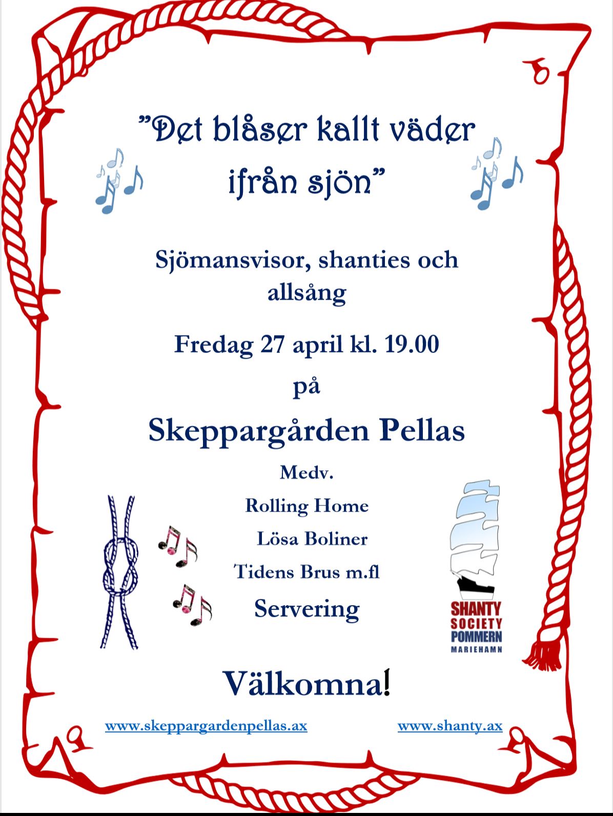 Vi ses fredagen den 27 april kl. 19 på Pellas i Lemland. Då sjunger vi på shantyaftonen. Kom dit! Det blir skoj!