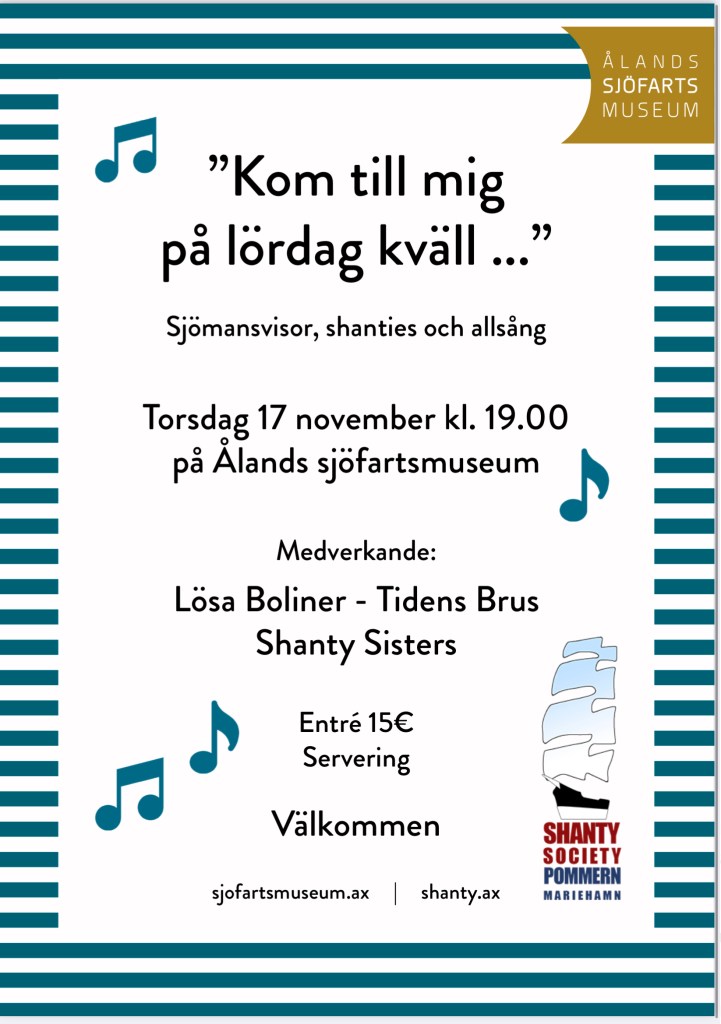 Mellan de sista föreställningarna av ”På världens alla hav” sjunger vi också på Shanty Society Pommerns shantyafton. Kom dit. Det blir skoj!